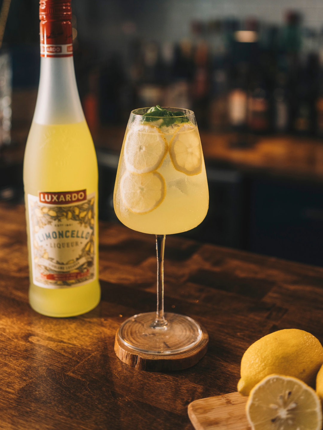 In a wine glass, add ice and lemon wheels. Squeeze fresh lemon juice over top. Add Prosecco and limoncello then top with soda water. Garnish with basil.