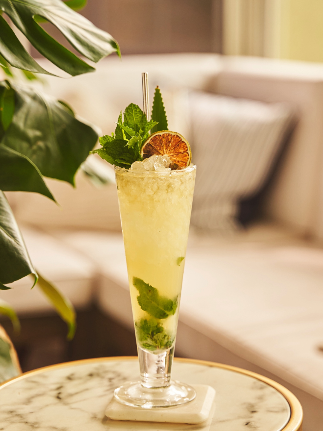 Combine all ingredients except for the salt and garnish into a mixing glass with ice. Stir and strain into a Nick and Norah glass. Garnish with dehydrated pineapple and leaf (optional), top with smoked salt. Serve and enjoy!