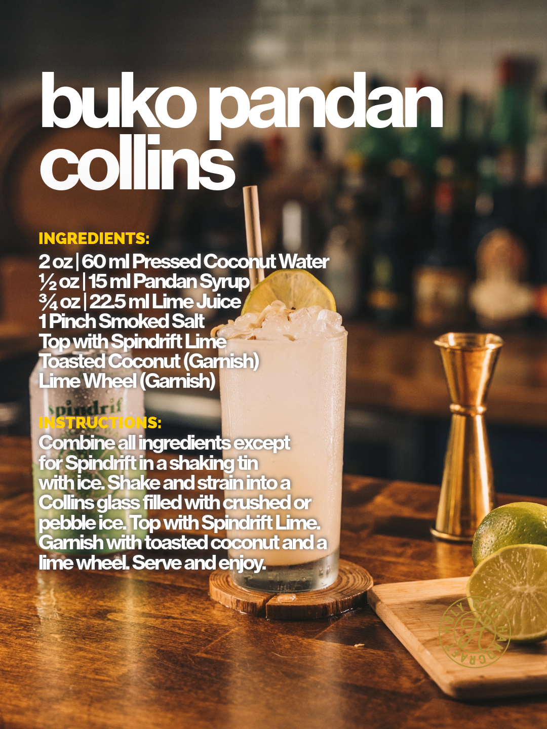 Combine all ingredients except for Spindrift in a shaking tin with ice. Shake and strain into a Collin’s glass filled with crushed or pebble ice. Top with Spindrift Lime. Garnish with toasted coconut and a lime wheel. Serve and enjoy.