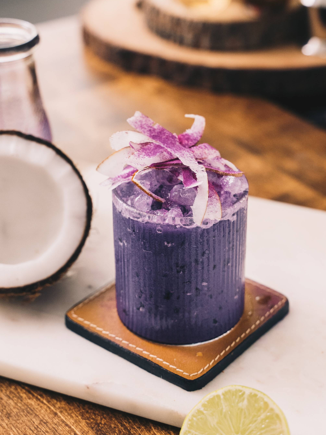 Combine ingredients (except garnishes) in a cocktail shaker with ice. Shake and strain over pebble ice in a rocks glass. Garnish with a dusting of Ube powder and shaved coconut . Serve and enjoy.