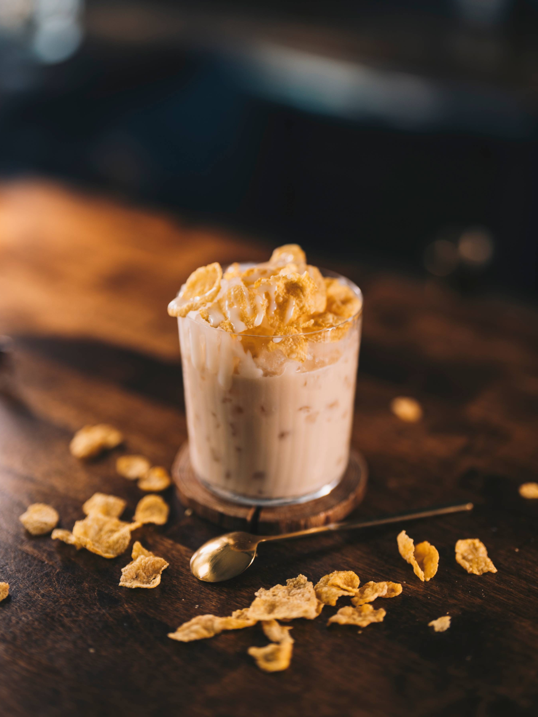 Add all ingredients except corn flakes and condensed milk into a shaking tin with ice. Shake and strain over crushed or pebble ice (although traditionally served over shaved ice). Garnish with corn flakes, top with condensed milk. Serve with a spoon.