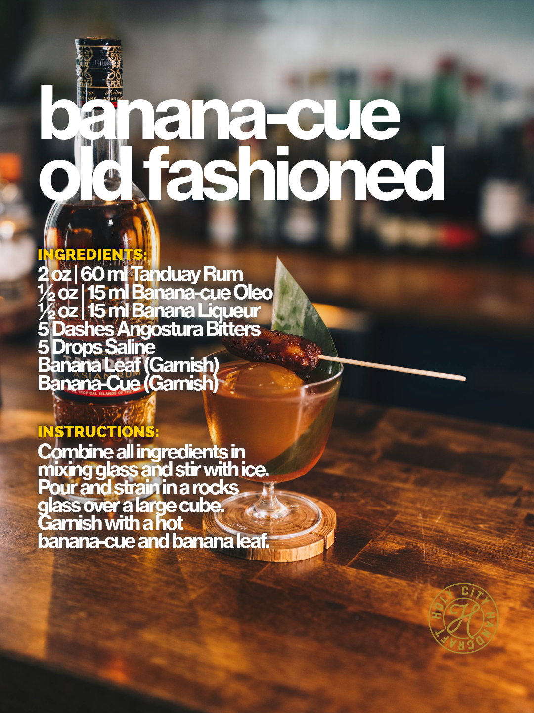 Combine all ingredients in mixing glass and stir with ice. Pour and strain in a rocks glass over a large cube. Garnish with a hot banana-cue and banana leaf.