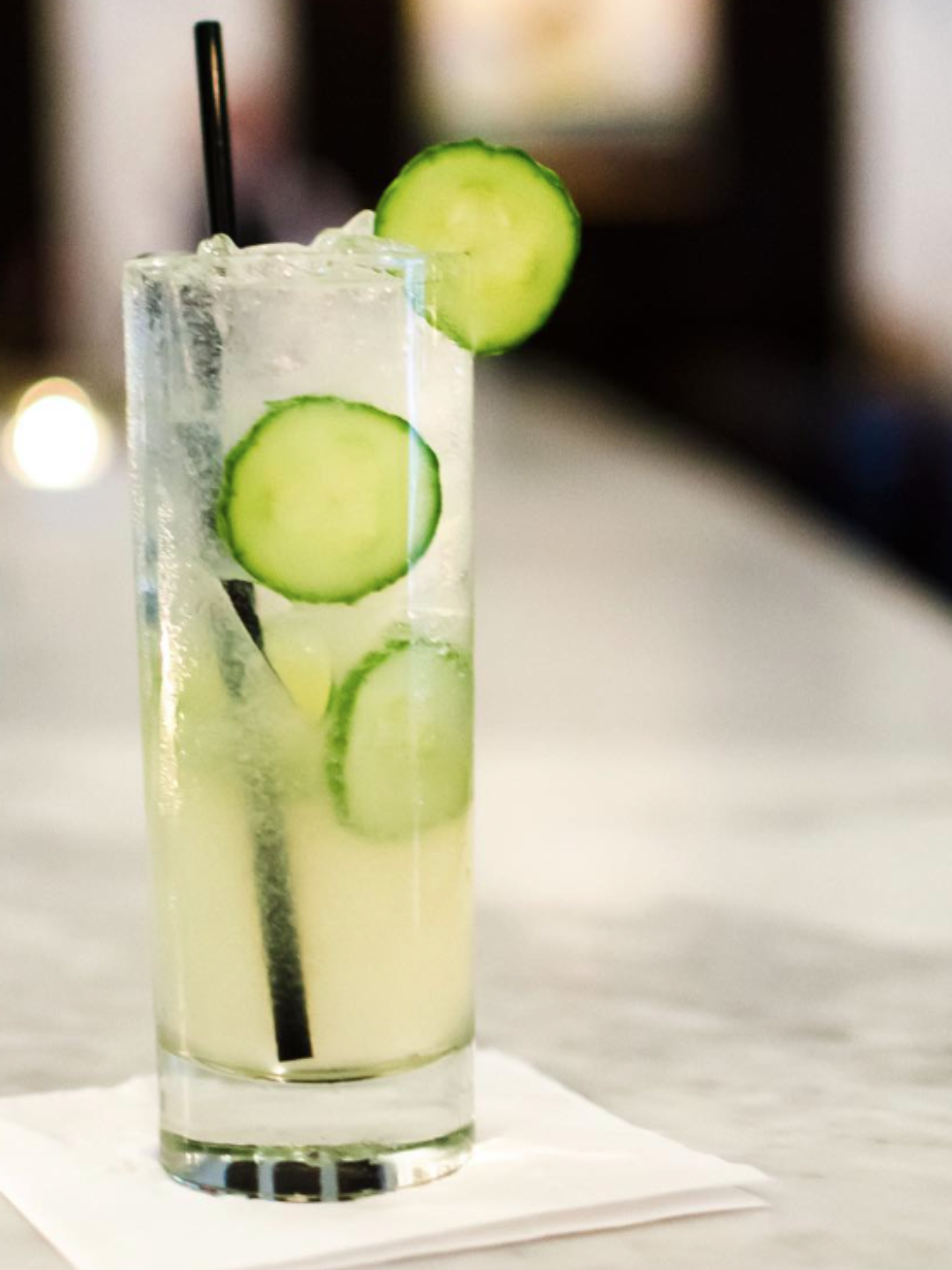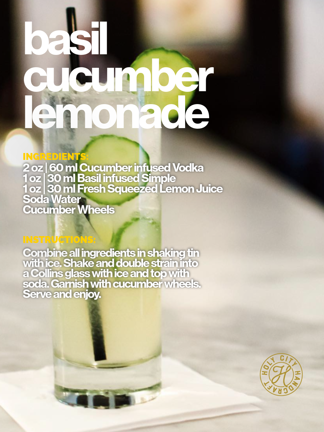 Combine all ingredients in shaking tin with ice. Shake and double strain into a Collins glass with ice and top with soda. Garnish with cucumber wheels. Serve and enjoy.