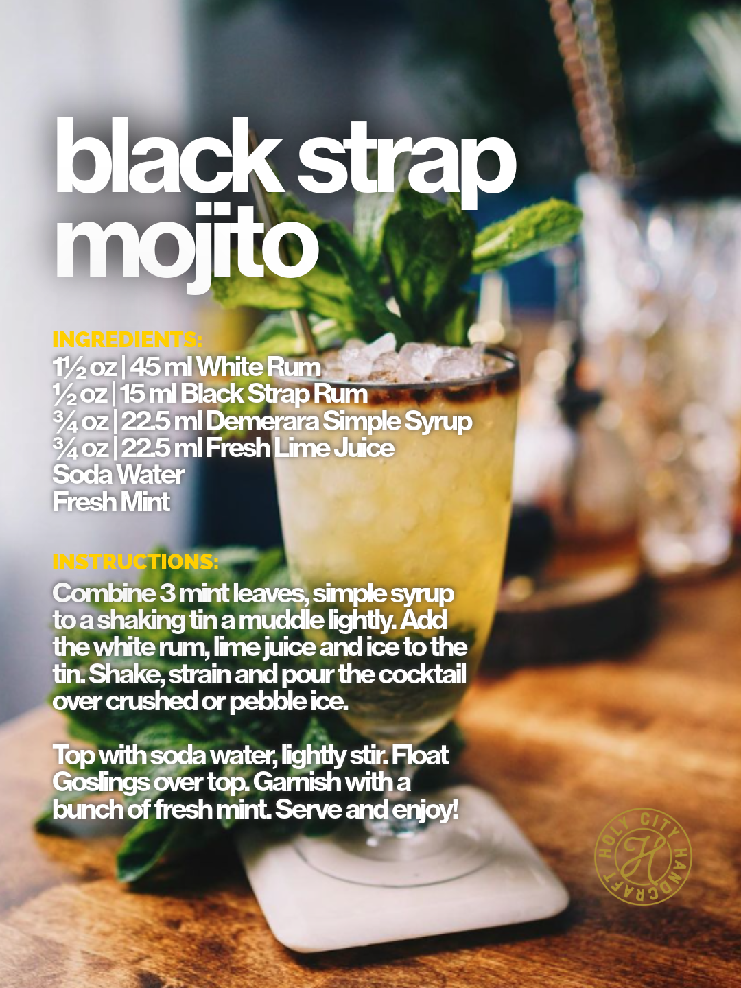 You canβt beat this riff on a Mojito. Especially when you top it with a healthy dose of black strap rum.
