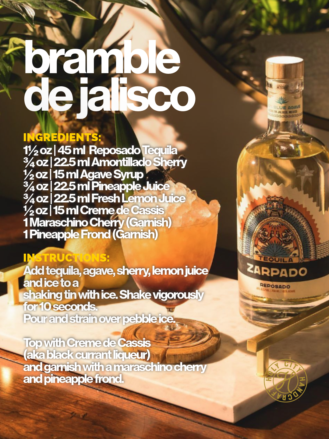 Add tequila, agave, sherry, lemon juice and ice to a shaking tin with ice. Shake vigorously for 10 seconds. Pour and strain over pebble ice. Top with Creme de Cassis (aka black currant liqueur) and garnish with a maraschino cherry and pineapple frond.