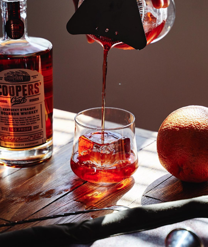 Combine Bourbon Whiskey, Campari, sweet vermouth and bitters in a mixing glass with ice. Stir for 10 seconds. Strain and pour over a crystal clear ice cube. Express a grapefruit peel and proceed to char the peel until aromatic. Serve and Enjoy!