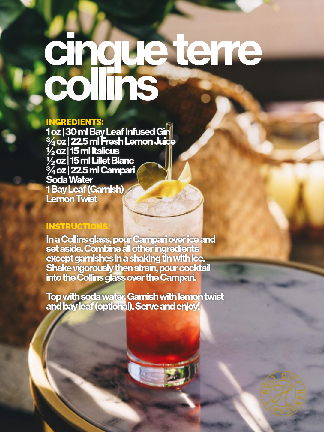 In a Collins glass, pour Campari over ice and set aside. Combine all other ingredients except garnishes in a shaking tin with ice. Shake vigorously then strain, pour cocktail into the Collins glass over the Campari. Top with soda water. Garnish with lemon twist and bay leaf (optional). Serve and enjoy!
