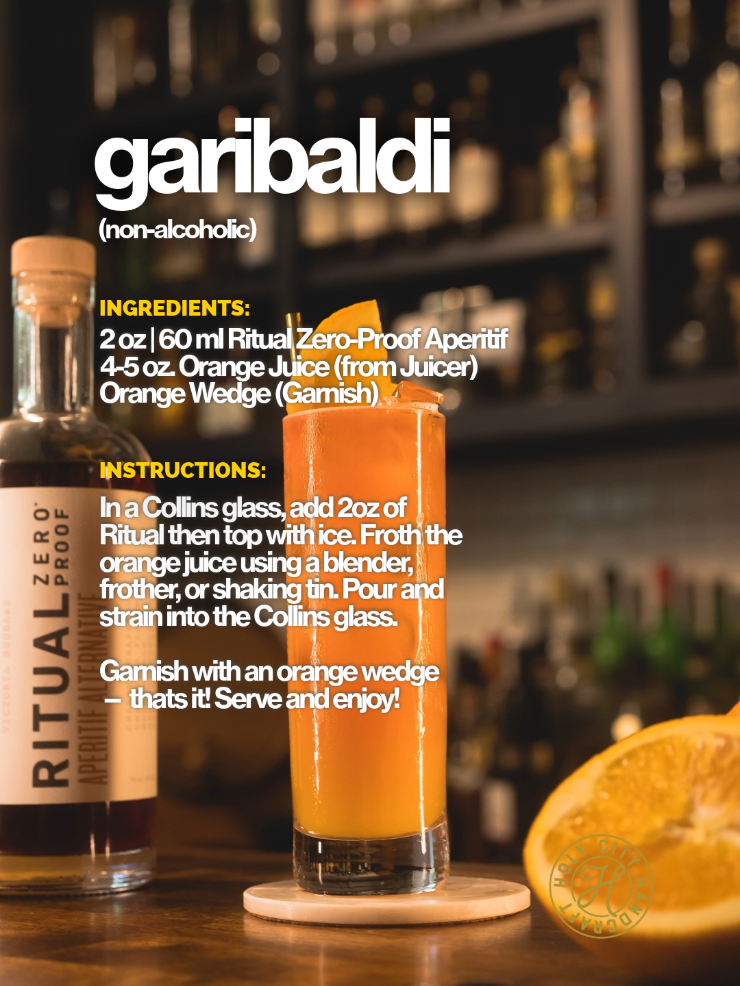 The GARIBALDI the signature cocktail over at @dantenewyorkcity but with my friends at @ritualzeroproof, I wanted to make a #NoABV version with their new NA Aperitif. The key to this cocktail is the texture, the frothiness in vigorously shaking or frothing orange juice brings a light and fluffy mouthfeel to this simple recipe. Its a great mix of bitter, citrusy and this new Ritual Aperitif didn’t disappoint, its got familiar notes of bitter, citrus and even adds a bit of a kick that you won’t normally find in other NA spirits.