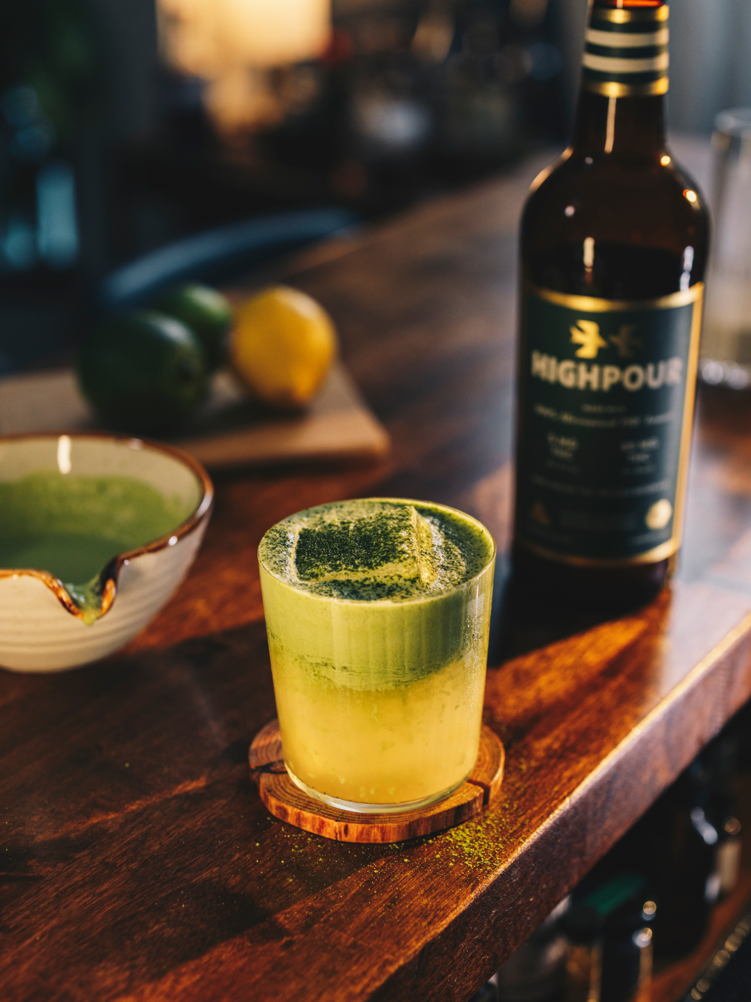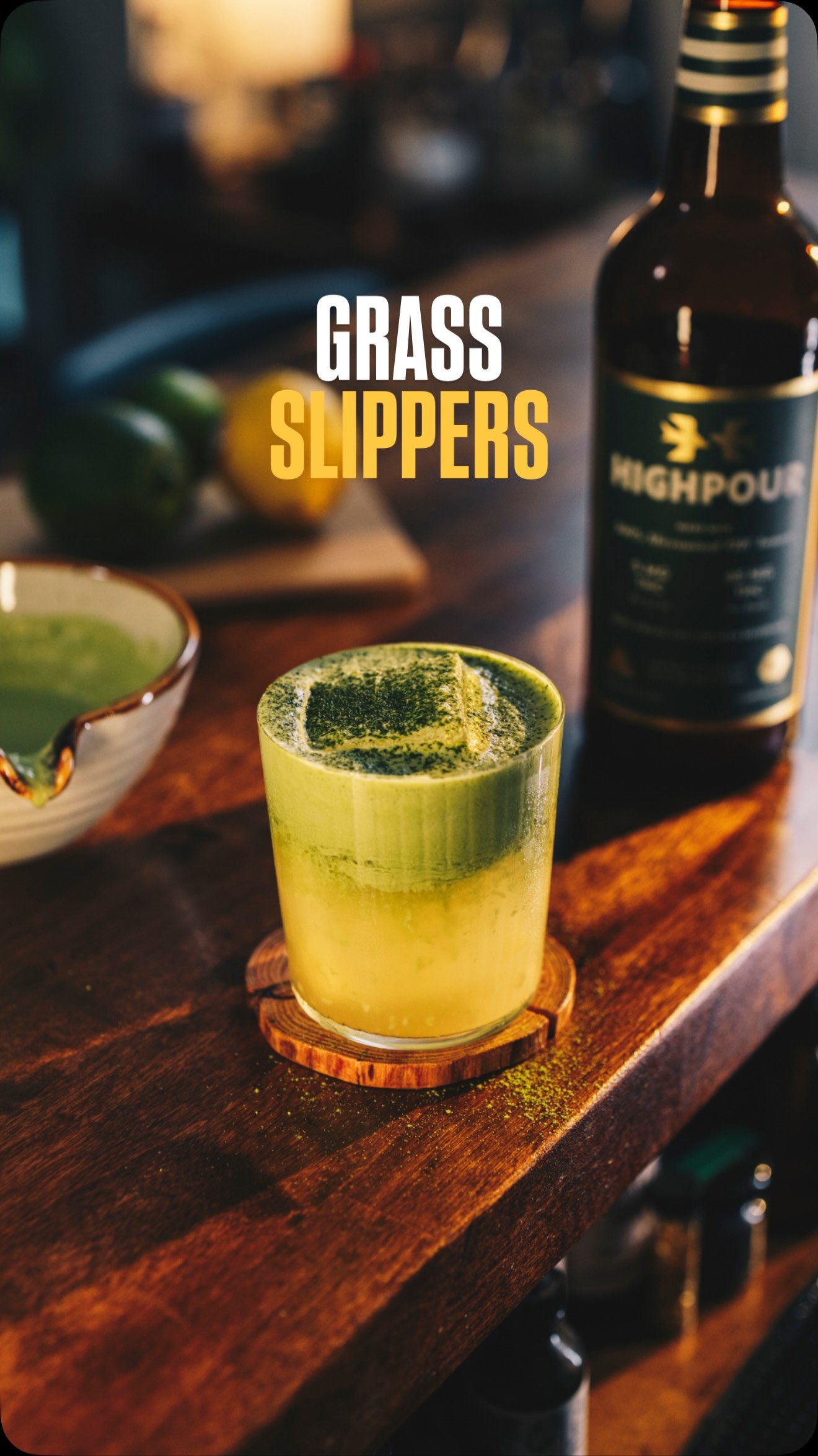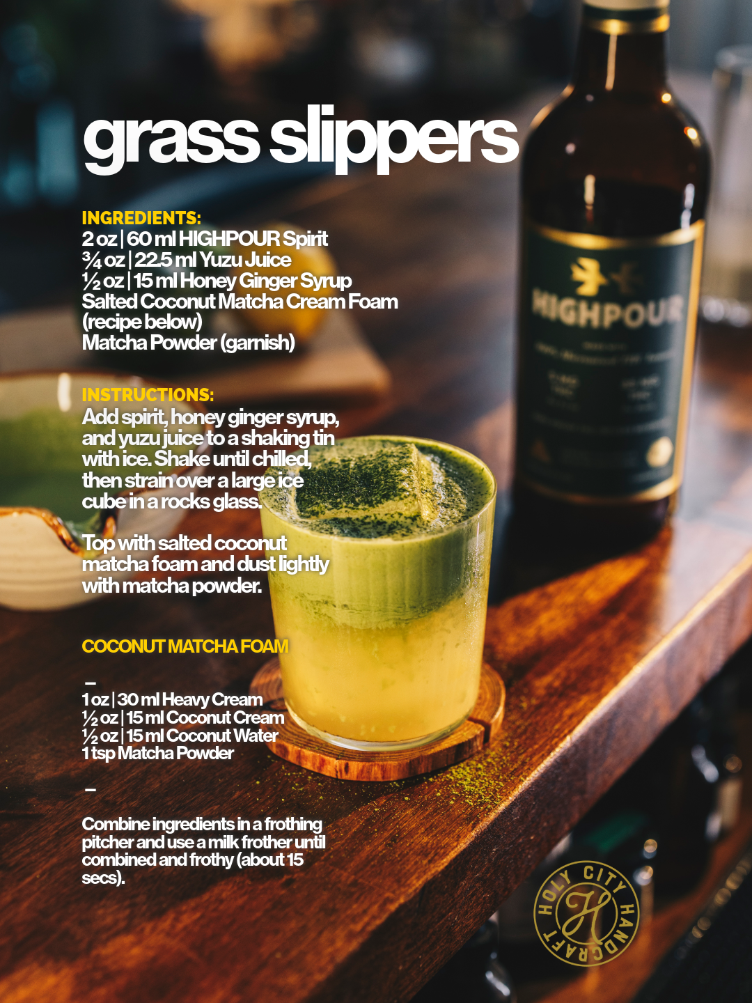 Bright citrus, soft sweetness, and a creamy matcha finish — Grass Slippers leans fresh but still feels layered. Yuzu brings sharp acidity, honey ginger syrup adds warmth, and HIGHPOUR Spirit keeps the backbone clean and structured. The salted coconut matcha foam ties it all together with texture and a subtle savory note.