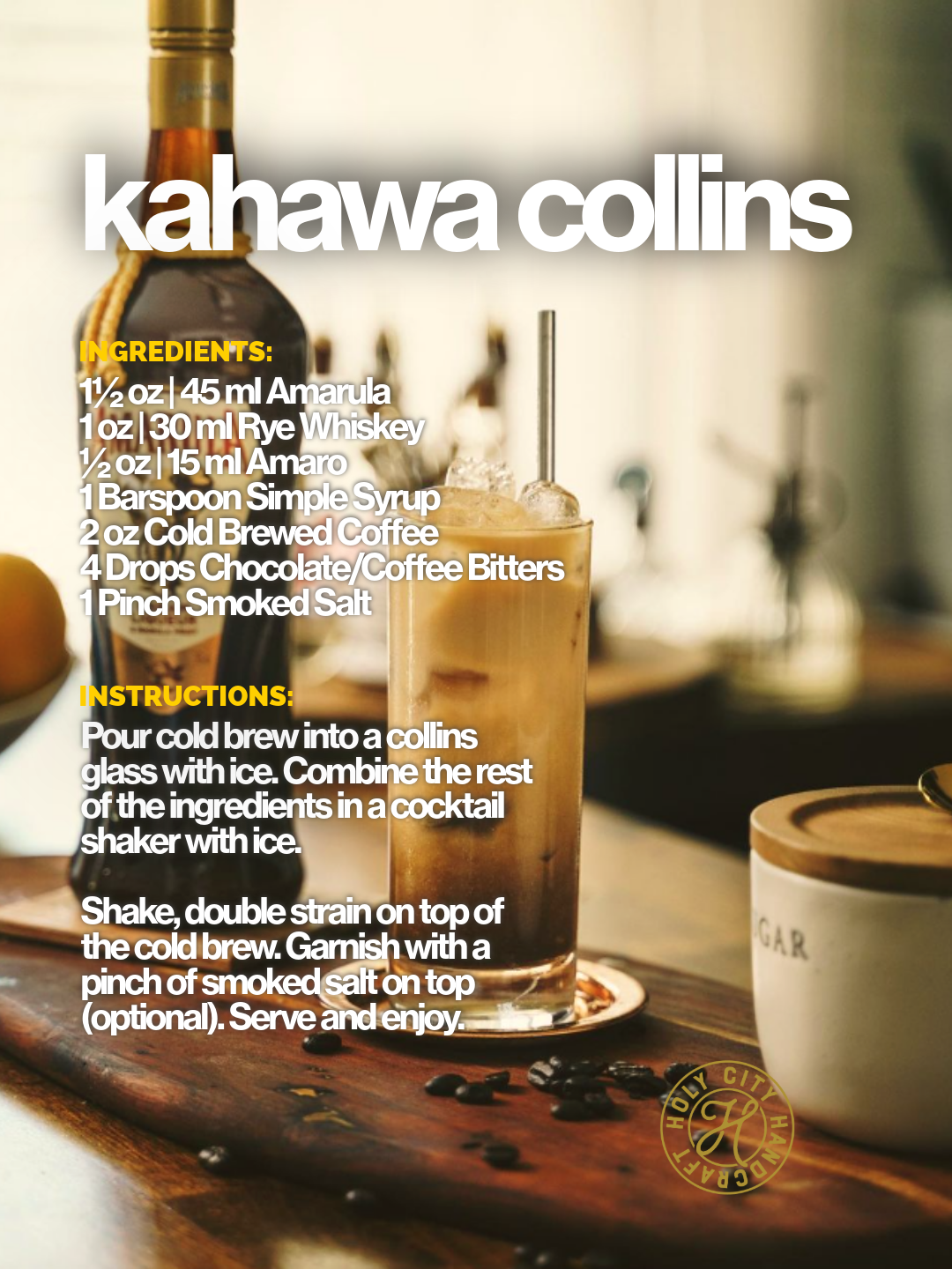 Pour cold brew into a collins glass with ice. Combine the rest of the ingredients in a cocktail shaker with ice. Shake, double strain on top of the cold brew. Garnish with a pinch of smoked salt on top (optional). Serve and enjoy.