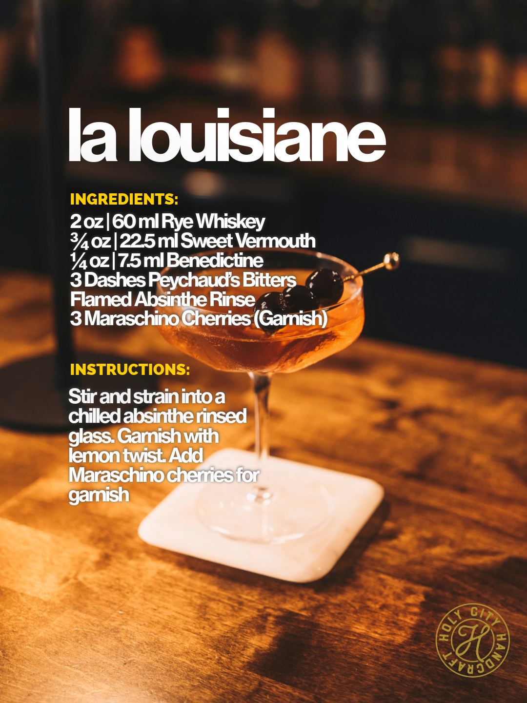 Stir and strain into a chilled absinthe rinsed glass. Garnish with lemon twist. Add Maraschino cherries for garnish