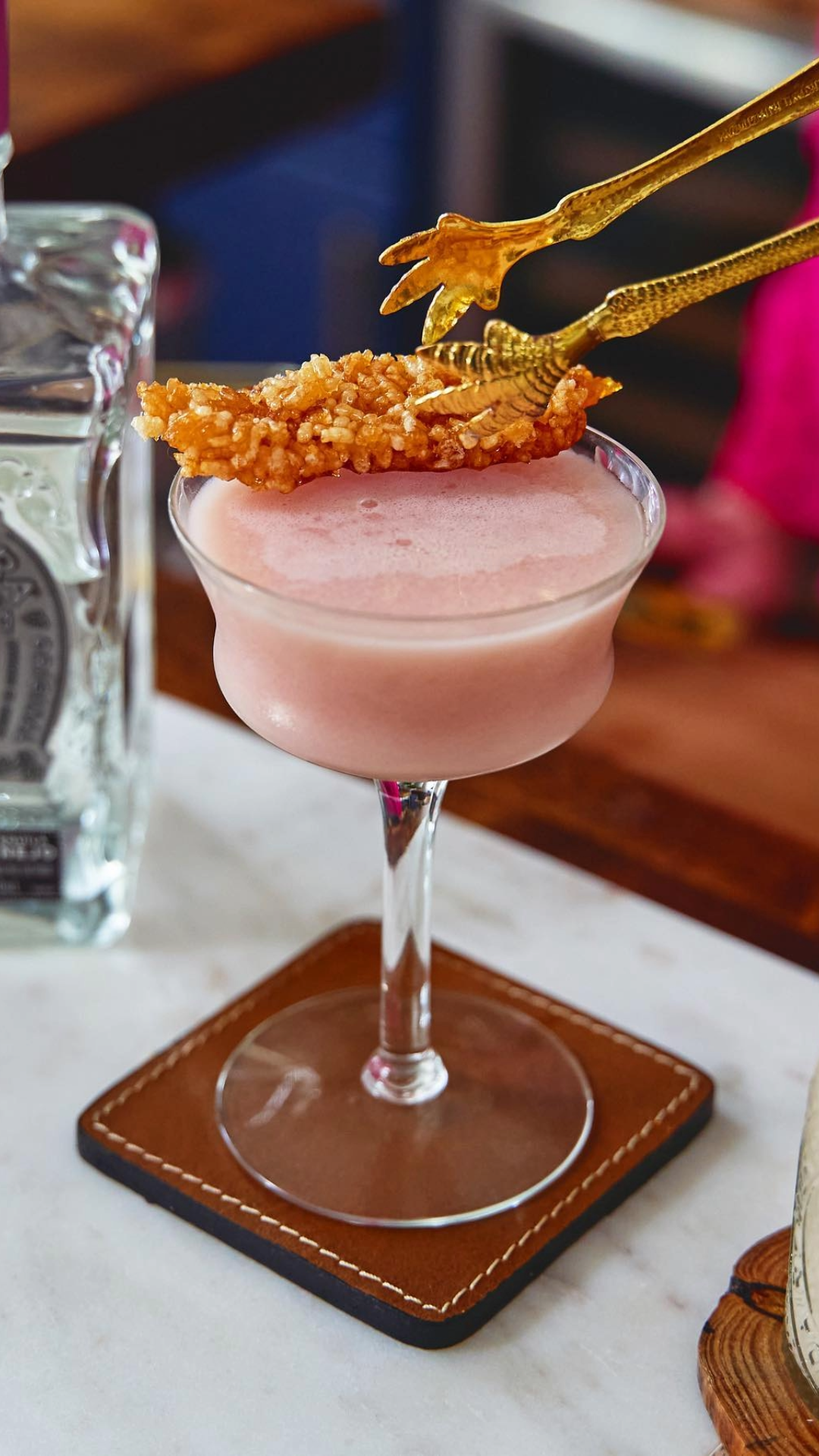 “Carolina Gold Rice is a huge staple here in the Lowcountry. I wanted to showcase the grain in a way that added some Latin flair to a southern classic. The already creamy texture of the rice lends itself well to horchata, and the vanilla and cinnamon notes in the rice milk play off of the same velvety vanillin undertones found in Herradura Ultra. Combined with cinnamon infused brandy, raspberry cordial, a touch of lime, and finished with rhubarb bitters, this cocktail will have you ready to face a forgiving southern winter. Garnish with puffed rice brittle and enjoy!