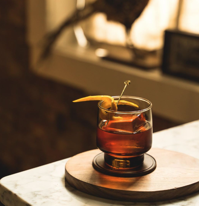 Stirred. Served over a stamped clear ice cube. Garnished with citrus peel.