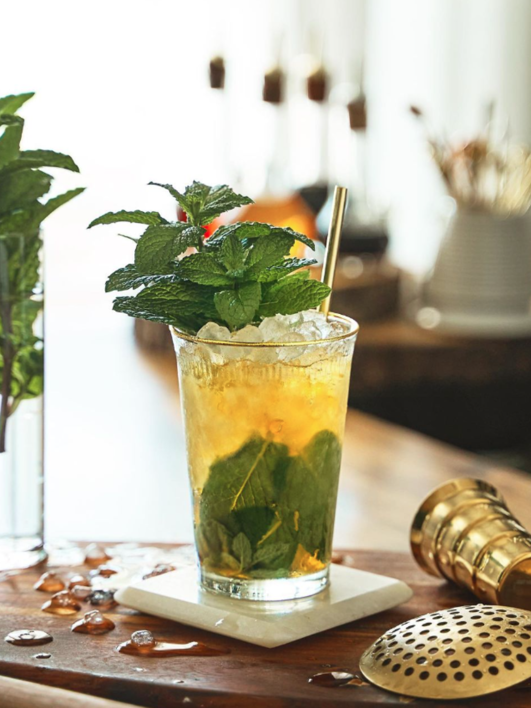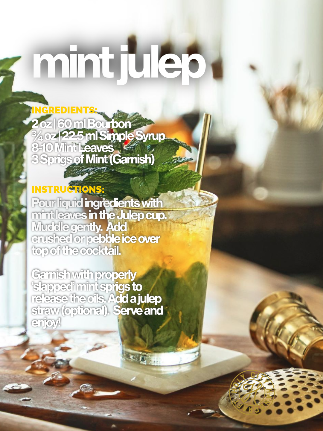 Pour liquid ingredients with mint leaves in the Julep cup. Muddle gently. Add crushed or pebble ice over top of the cocktail. Garnish with properly ‘slapped’ mint sprigs to release the oils. Add a julep straw (optional). Serve and enjoy!