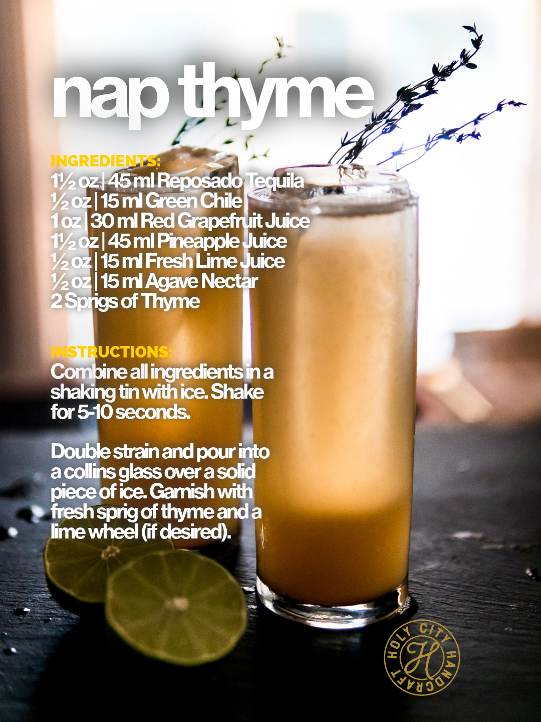 Combine all ingredients in a shaking tin with ice. Shake for 5-10 seconds. Double strain and pour into a collins glass over a solid piece of ice. Garnish with fresh sprig of thyme and a lime wheel (if desired).