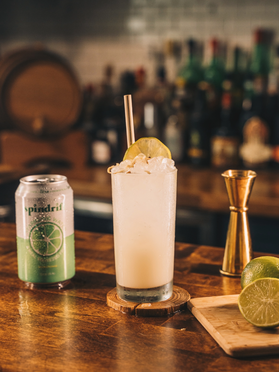 Combine all ingredients except for Spindrift in a shaking tin with ice. Shake and strain into a Collin’s glass filled with crushed or pebble ice. Top with Spindrift Lime. Garnish with toasted coconut and a lime wheel. Serve and enjoy.