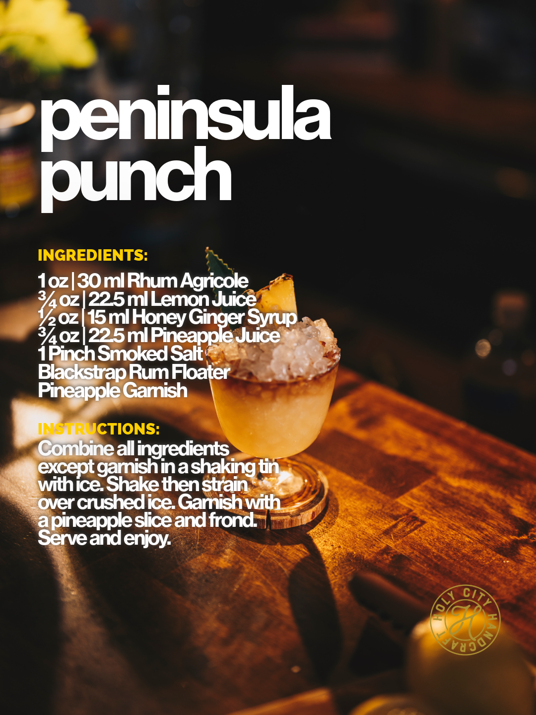 With this series, we always make a drink to match. Enter, the Peninsula Punch. This recipe showcases some local honey, rum (because of Charleston's historical ties) and of course the unofficial symbol of this city, the pineapple, because Charlestonians truly pride themselves on hospitality. Combined with smoked salt and finished with a black strap rum floater, this is a recipe you'll be sipping all season long.