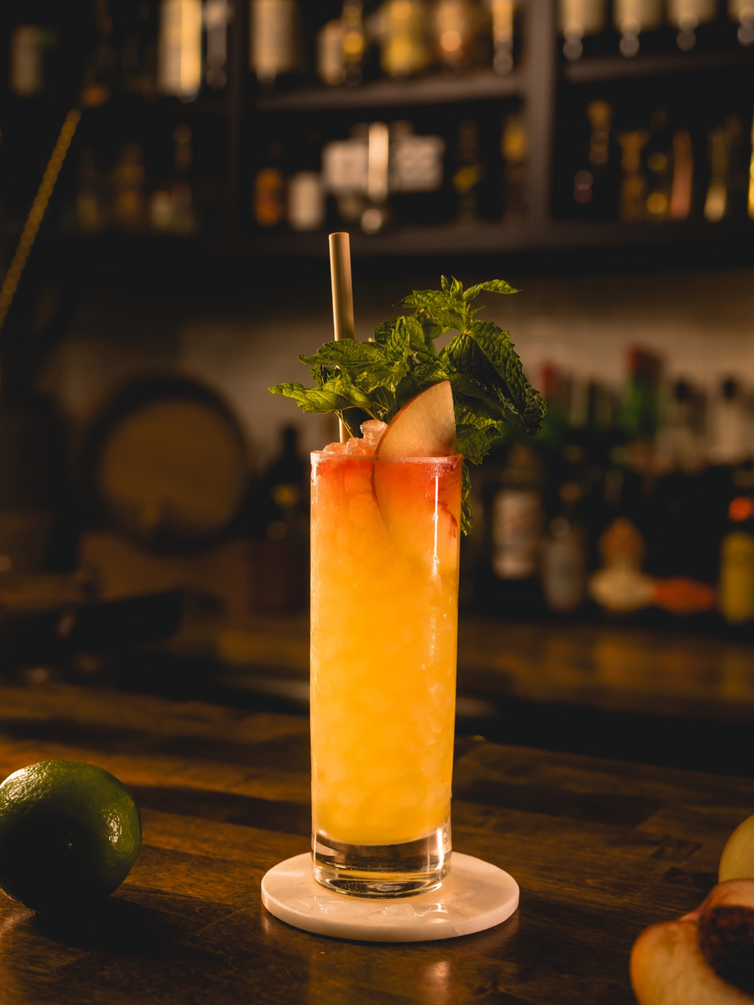 Combine all ingredients, shake and strain over crushed ice. Garnish with mint and peach.