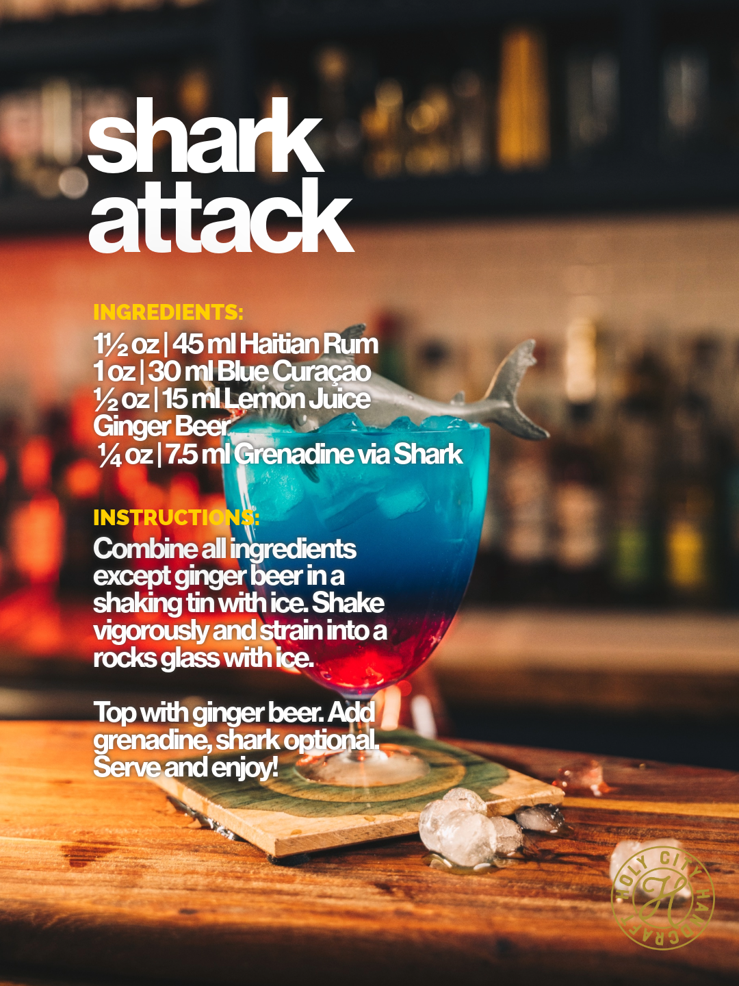 Combine all ingredients except ginger beer in a shaking tin with ice. Shake vigorously and strain into a rocks glass with ice. Top with ginger beer. Add grenadine, shark optional. Serve and enjoy!
