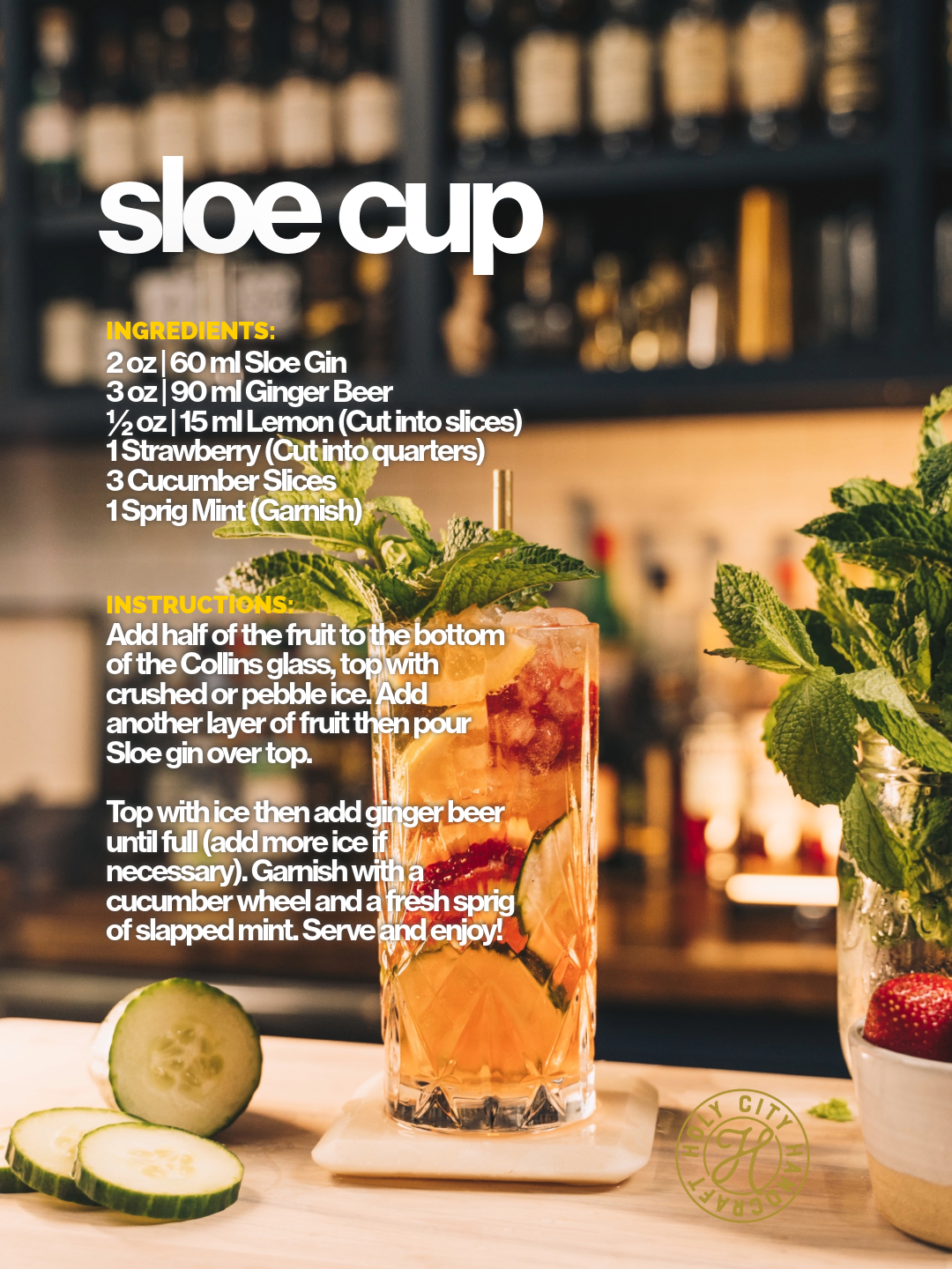 Add half of the fruit to the bottom of the Collins glass, top with crushed or pebble ice. Add another layer of fruit then pour Sloe gin over top. Top with ice then add ginger beer until full (add more ice if necessary). Garnish with a cucumber wheel and a fresh sprig of slapped mint. Serve and enjoy!