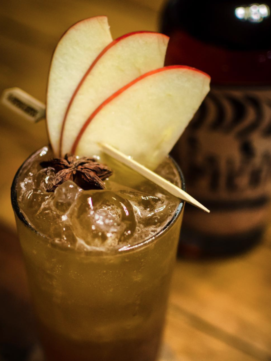 Combine the spiced rum, panels syrup and lemon juice in a shaking tin with ice and shake vigorously for 15 seconds. Strain into a Collins glass over ice. Top with sparkling apple cider. Garnish with sliced apples.