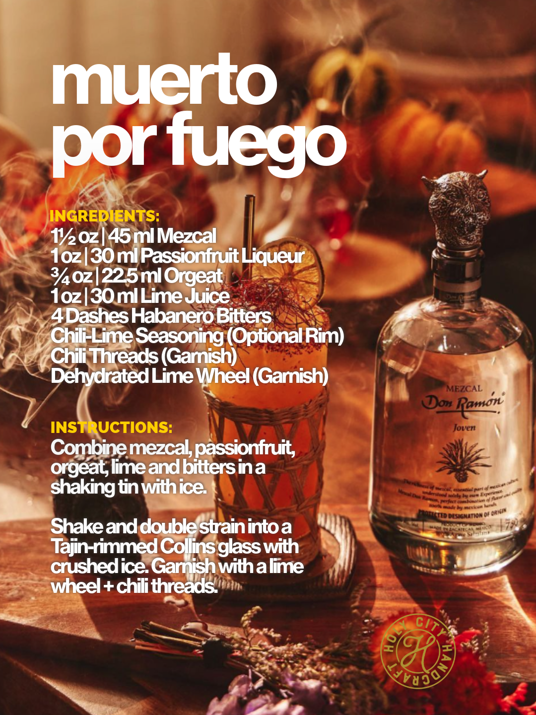 I’ve teamed up with my friends at casadonramon to create a cocktail recipe fitting to celebrate Dia de Los Muertos and here it is. Hints of spice and tropical fruit balance well with the subtle smokiness of this mezcal to provide a refreshing cocktail with a spicy kick. Salud!