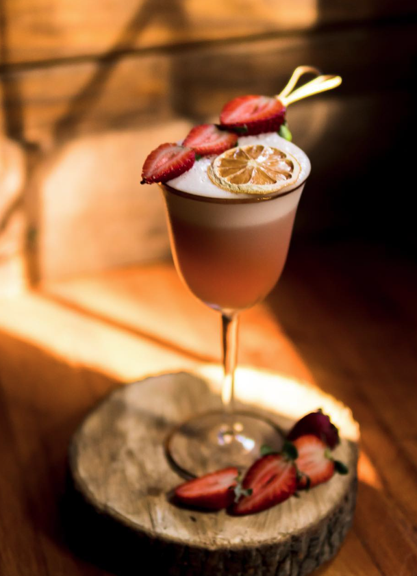 Combine all ingredients except the fresh strawberries and lemon wheel in shaking tin with ice. Reverse dry shake and double strain into a chilled coupe. Garnish with sliced strawberries lemon wheel. Serve and enjoy.