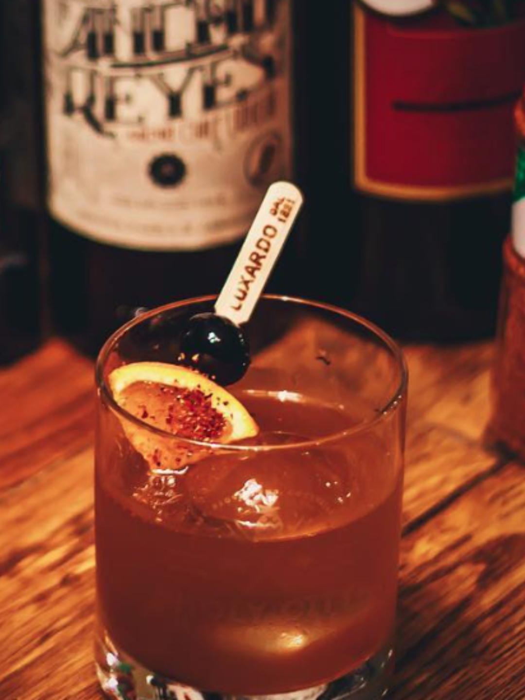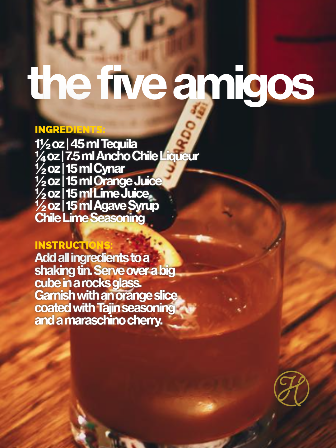 Add all ingredients to a shaking tin. Serve over a big cube in a rocks glass. Garnish with an orange slice coated with Tajin seasoning and a maraschino cherry.