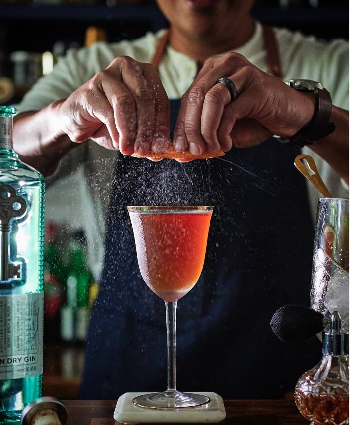 Combine all ingredients except orange bitters and twist in a mixing glass with ice. Stir, strain and pour the cocktail in a chilled coupe. Express the orange peel, spritz with bitters (optional) Serve and enjoy!