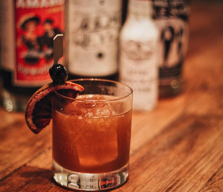 Shake and strain into a rocks glass. Garnish with blood orange wedge and cherry.