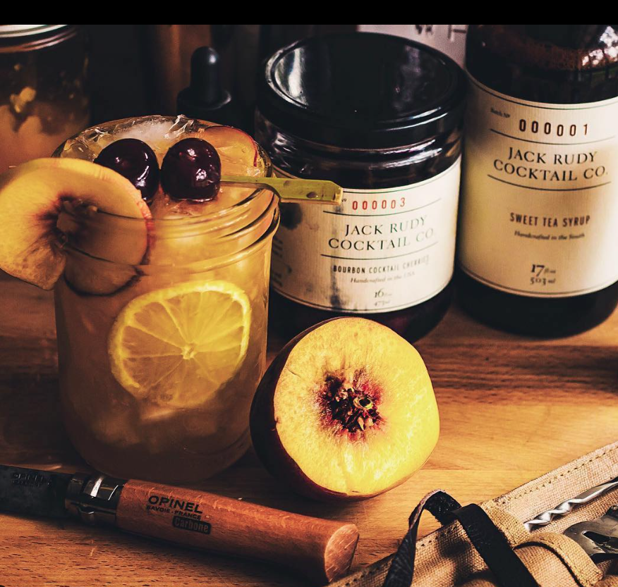 In a shaker, add lemon wedges and muddle until all juice is squeezed. Add bourbon, sweet tea syrup and peach puree. Add ice and shake vigorously for 30 seconds. In a mason jar, add crushed ice. Strain cocktail onto the crushed ice. Garnish with slices of lemon and peach. Top with Bourbon Cocktail Cherries.