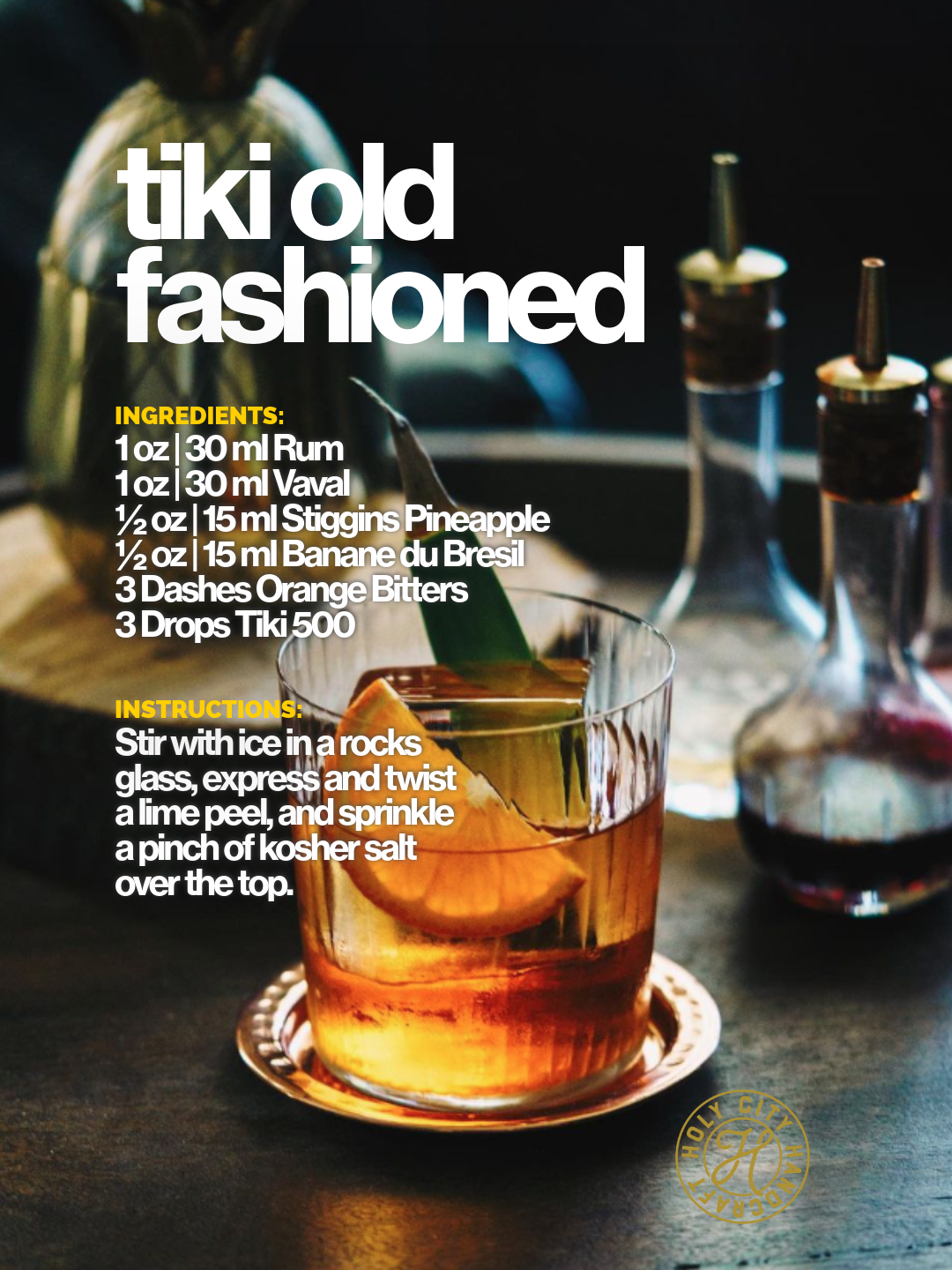 Combine all ingredients in a mixing glass with ice. Stir, strain and pour the cocktail over a large ice cube. Garnish with a slice of orange + pineapple frond (optional).