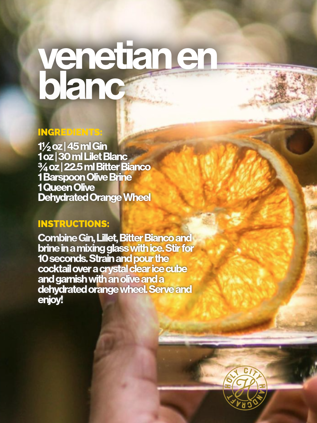 Combine Gin, Lillet, Bitter Bianco and brine in a mixing glass with ice. Stir for 10 seconds. Strain and pour the cocktail over a crystal clear ice cube and garnish with an olive and a dehydrated orange wheel. Serve and enjoy!